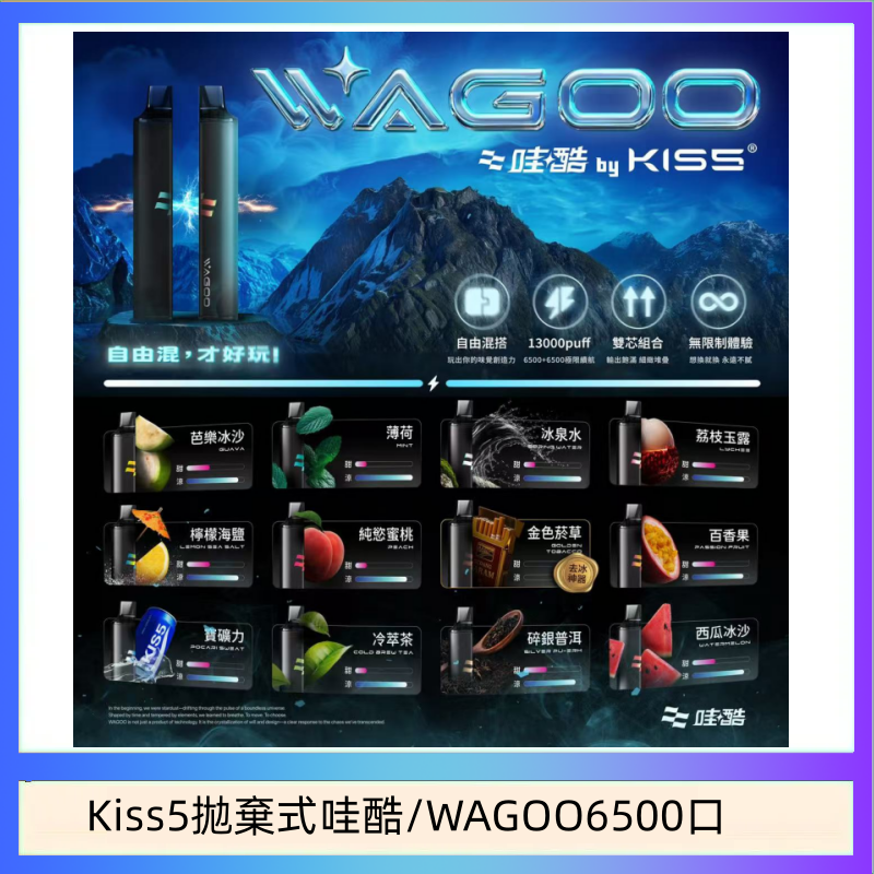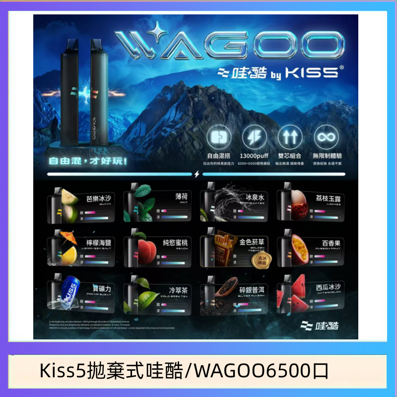 WAGOO & KIS5 6500口拋棄式電子煙,採用雙芯結構以容納兩種不同風味。支援單口味輸出,也具備雙口味混合模式,可在吸氣時同時調動兩組霧化芯,形成混合風味的使用體驗。由於為預填式設計,使用者無需自行加注霧化液。